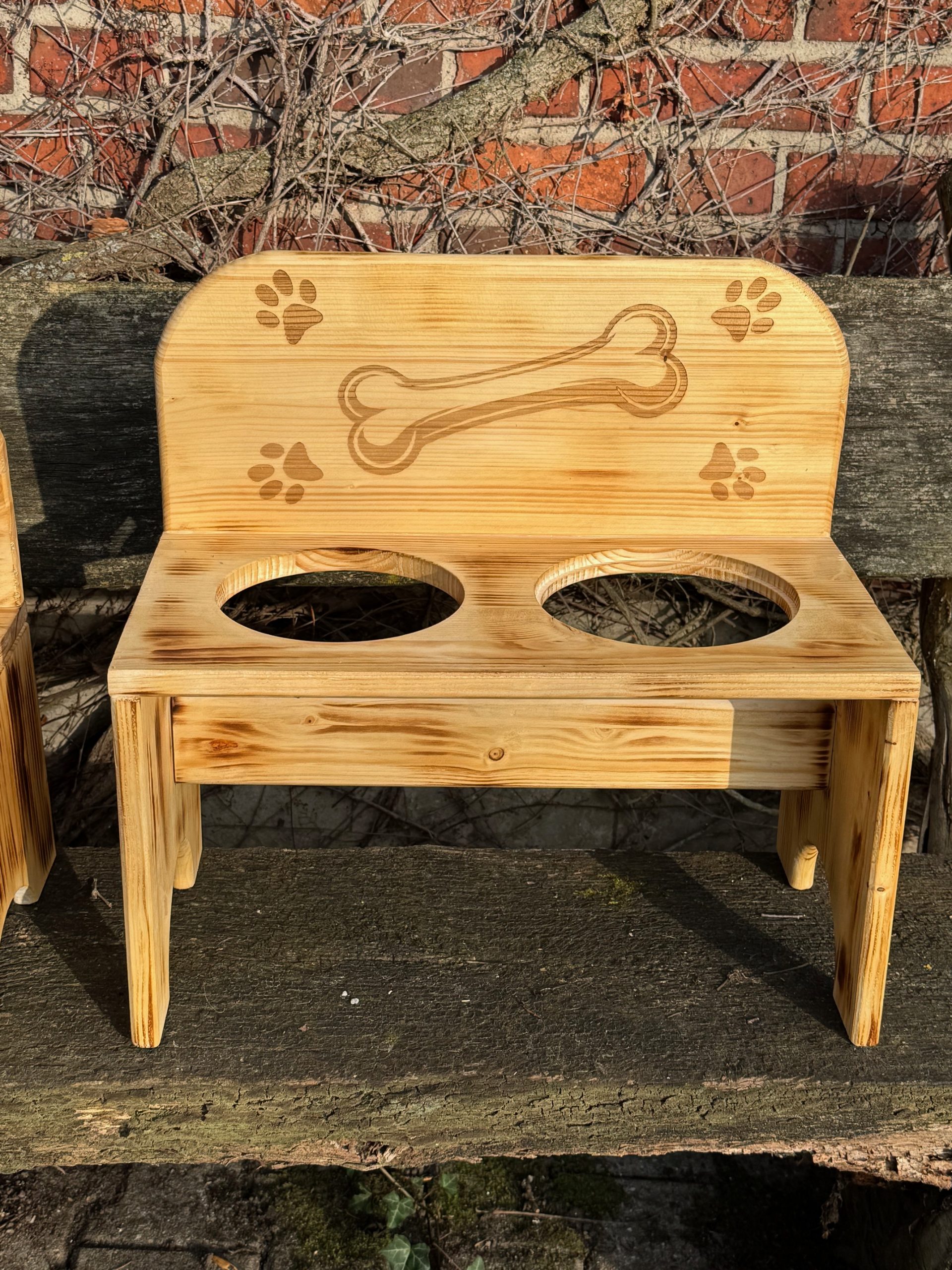 Die natürliche Holzstruktur, kombiniert mit den dekorativen Branddetails und den eingravierten Pfotenabdrücken, verleiht der Futterstation einen rustikalen und gleichzeitig stilvollen Charakter. Dadurch passt sie perfekt in moderne Wohnräume, gemütliche Landhausstile oder den Gartenbereich.